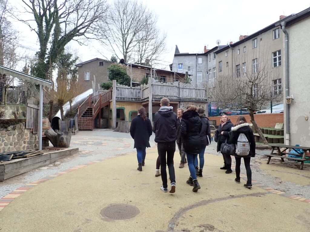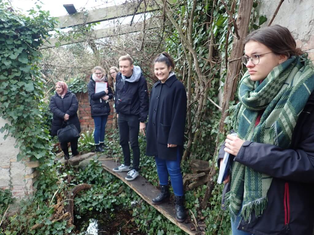Heute sind die Bundesfreiwilligen in Eberswalde auf Exkursion. Gemeinsam mit Landschaftsarchitekt Andreas Timm begehen sie von ihm gestaltete Flächen, die gezielt eine hohe biologische Vielfalt aufweisen. Der private „Plantasiegarten“ von Andreas Timm ist die erste Station der Besichtigungen. Hier ist der Landschaftsarchitekt bestrebt, Vielfalt, angelehnt an einen Urwald mit verschiedenen Biotopen und dichtem Bewuchs, auf kleinem Raum zu schaffen. In der Pfeilstraße in Eberswalde besichtigen sie einen Hinterhofgarten einer Kita, indem das Augenmerk auf die Gestaltung natürlicher Kinderspielräume und Bewegungsmöglichkeiten durch entsprechende Holzbauten lag. An der letzten Station besichtigen die Bundesfreiwilligen den neuen Blumenplatz vor dem Humboldt-Gymnasium in Eberswalde. Diese in der Vergangenheit brachliegende Fläche wurde insbesondere für die Schülerinnen und Schüler des Gymnasiums als Verweilort mit vielfältigem Pflanzenreichtum angelegt. Es wurden verschiedene Biotope geschaffen, um die Vielfalt an Flora und Fauna zu erhöhen. Die Wahl der Pflanzen wurde ganz bewusst so gesetzt, dass der Platz vom Frühjahr bis in den späten Herbst hinein blüht. Mit Hinblick auf die Materialwahl und Bauweise für beispielsweise Weganlage oder Trockensteinmauer ist dieser Blumenplatz ein gutes Anschauungsobjekt und inspiriert die Teilnehmenden sehr. Die Anregungen des heutigen Tages fließen in den kommenden Wochen in die Gestaltung der Projektfläche im Brandenburgischen Viertel mit ein.