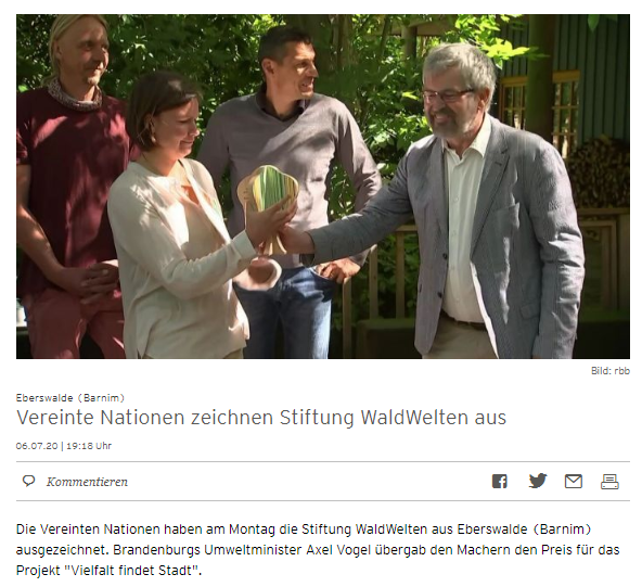 Unser Projekt wurde als offizielles Projekt der „UN-Dekade Biologische Vielfalt“ im Sonderwettbewerb „Soziale Natur – Natur für alle“ ausgezeichnet. Brandenburgs Umweltminister Axel Vogel übergab uns den Preis.