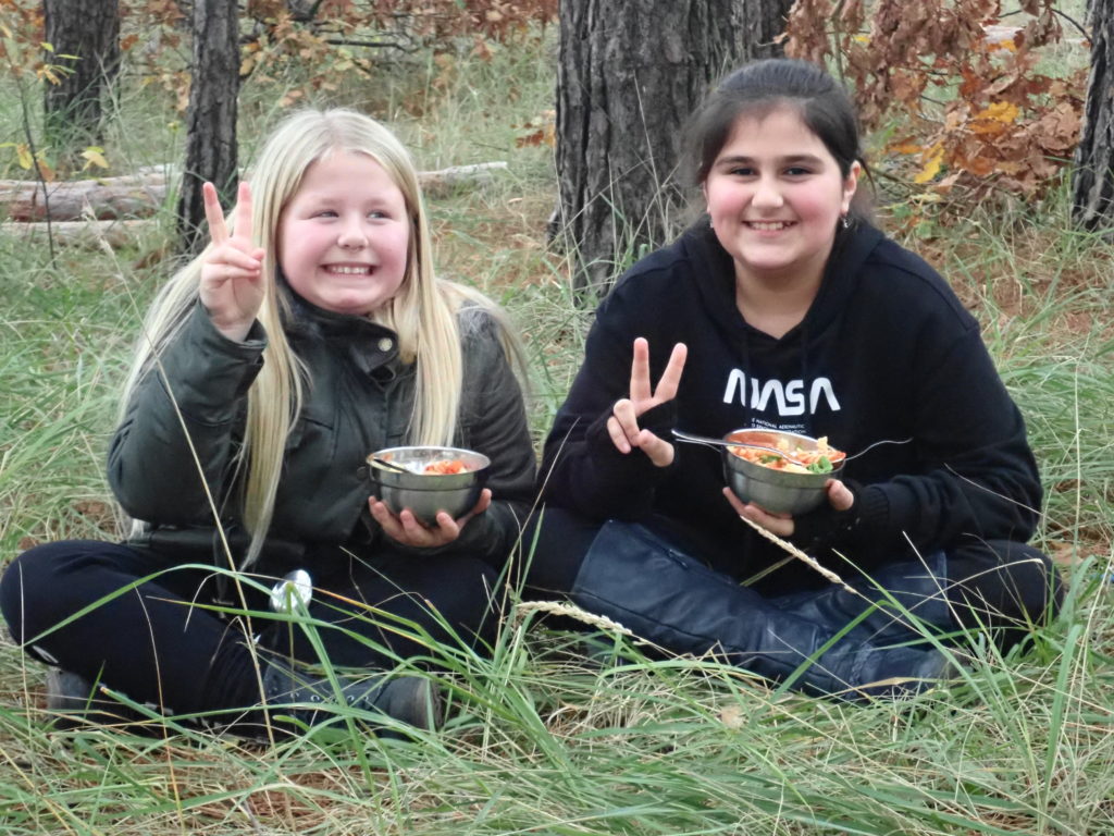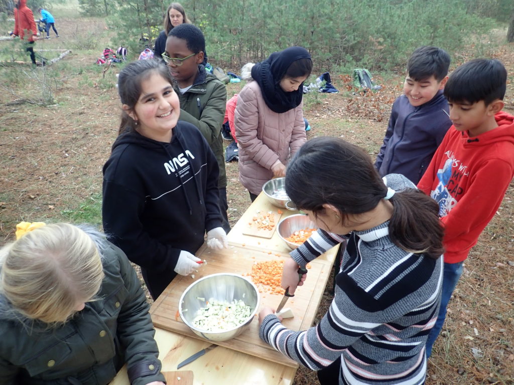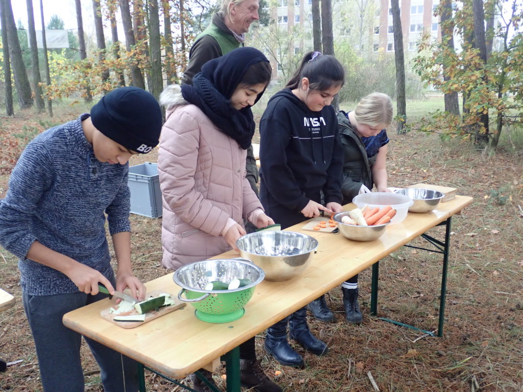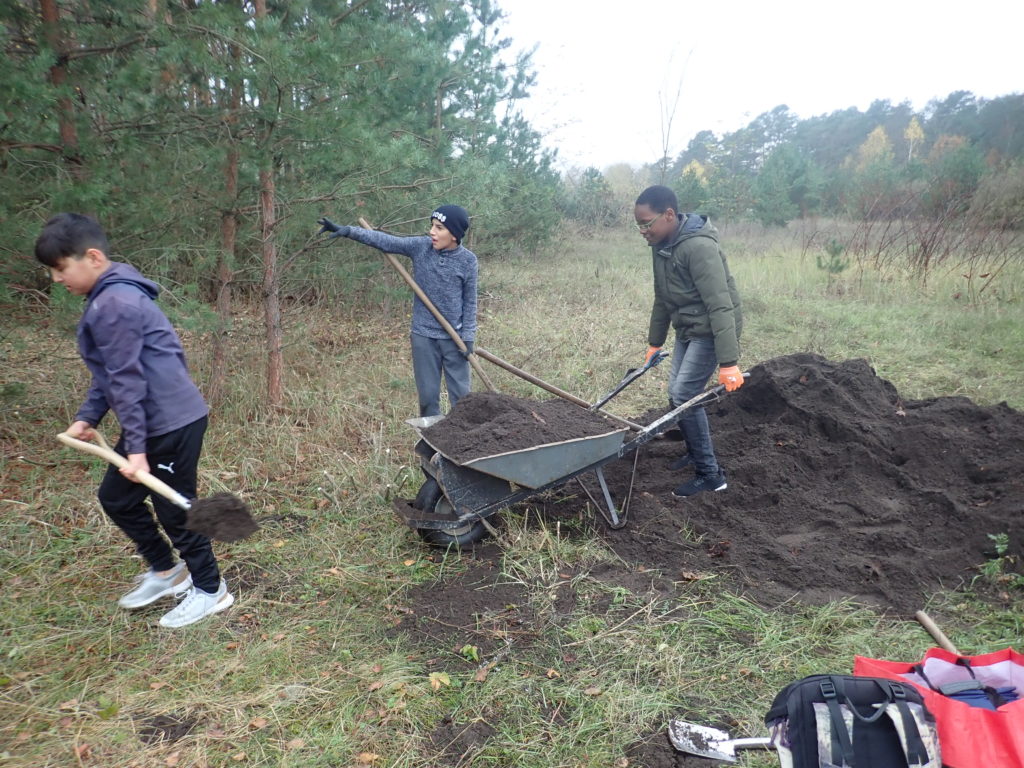 Da die ruderale Projektfläche im Brandenburgischen Viertel einen sehr mageren Boden aufweist, haben die Schülerinnen und Schüler zunächst extra große Löcher ausgehoben und den Boden mit Muttererde aufgewertet. So haben die Gehölze gute Voraussetzungen, um sich zu etablieren. Anschließend wurde die Erde um die Bäume herum festgetreten. Weil sich die Gehölze zu dieser Zeit in einer Ruhephase befinden und es immer wieder Niederschlag gibt, erübrigt sich das intensive Angießen nach der Pflanzung. So konnten wir uns dann dem leiblichen Wohl zuwenden und Pasta mit Tomatensoße über dem offenen Feuer zubereiten.