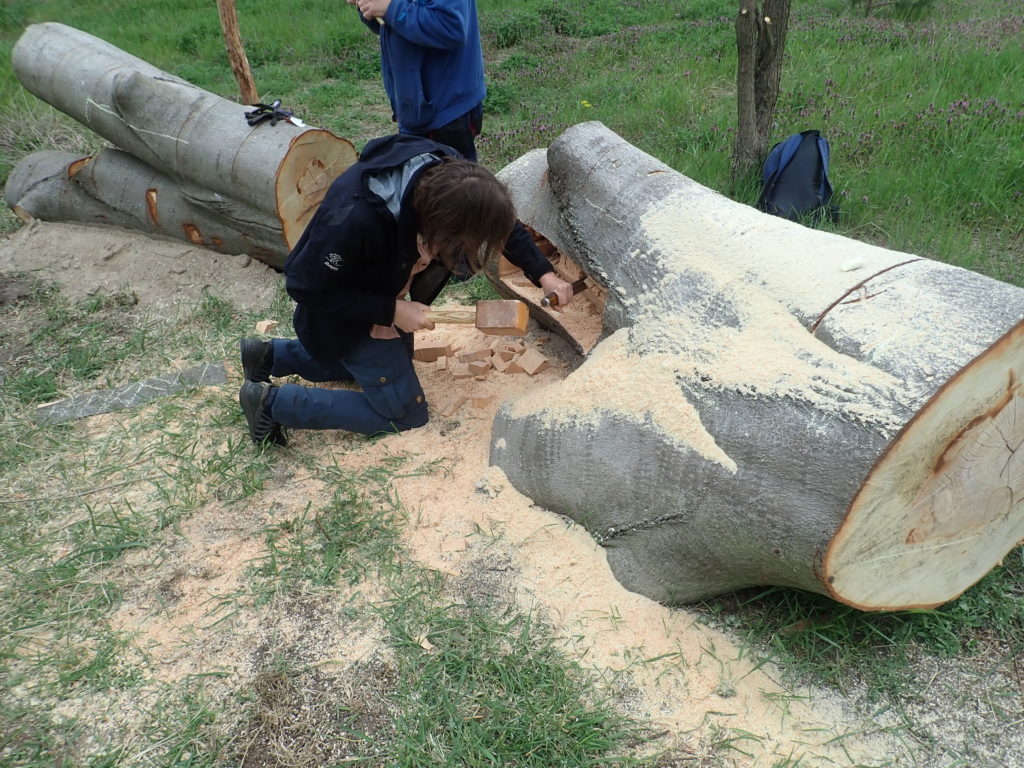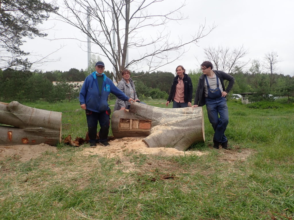 Weil es uns im Projekt wichtig ist, Wildbienen „sichtbar“ zu machen, also den Fokus der Anwohnenden auf die sonst eher versteckt lebenden Tiere zu lenken, entstand unsere Idee, zusätzliche Bienennisthilfen in existierendes Totholz zu integrieren und außerdem Bodennistmöglichkeiten am Stamm aufzuschütten. Entstanden ist eine Nisthilfe, die sich in die natürliche Umgebung einfügt und die Beobachtung von Wildbienen erleichtern kann. Und natürlich finden die Wildbienen auf der Heizhausfläche genügend Nist- und Futtermaterial in unmittelbarer Umgebung. Denn leider ist es so: Immer wieder sehen wir Nisthilfen inmitten sonst karger, blütenarmer Flächen stehen. So haben die Wildbienen zwar einen Brutplatz, aber weit und breit weder eine Nahrungsquelle für sich noch für ihre Brut. Wenn auch du eine Wildbienennisthilfe aufstellen möchtest, musst du auch sicher stellen, dass die BewohnerInnen Baumaterial und Nahrungsquellen in der Umgebung finden. Gerade in Städten kann das für die Wildbienen eine Herausforderung sein.