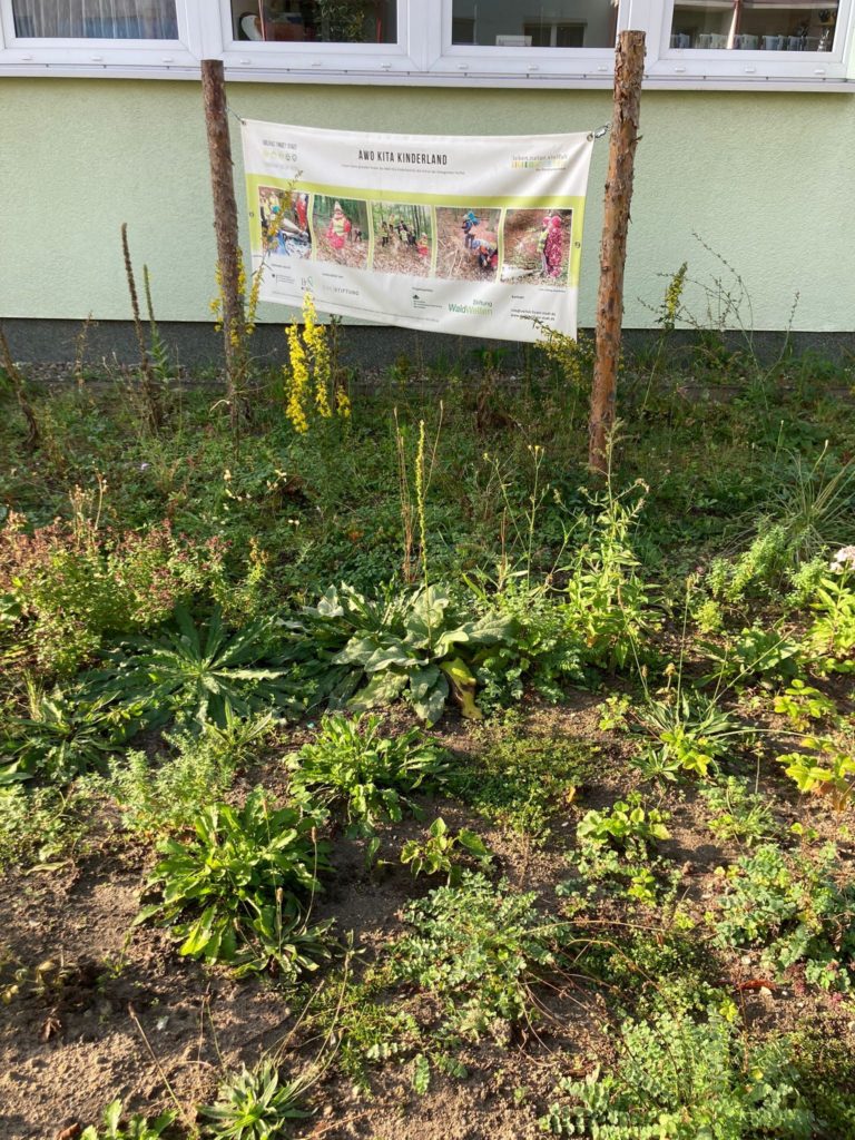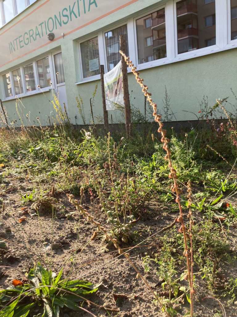 Es ist nicht nur fertig gepflanzt, es entwickelt sich auch mit aller Kraft. Wir sind erstaunt, wie gut sich schon jetzt eine Vielzahl der Pflanzen etabliert hat. Das haben wir vor allem dem fleißigen Gießen seitens der Kita in der Anwachsphase zu verdanken. Der Sommer war recht trocken und allein hätten es die Pflänzchen wahrscheinlich nicht gut geschafft. Nun geht es aber den Pflanzen gegen Ende des Sommers richtig gut und sie können sich teilweise schon wieder von selbst weiter versamen. Die Kinder der Kita Kinderland beobachten gespannt die Entwicklung und kommen mit ihren Eltern immer wieder an den Pflanzen zum Stehen, um dort auch eine Vielzahl an Insekten zu beobachten. Wir behalten die Fläche ebenfalls weiter im Blick und freuen uns darauf, was sie im nächsten Frühjahr zu bieten hat.