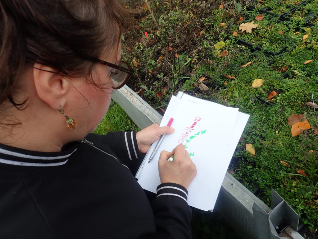 Dass für unsere Pflanzungen im Projekt immer ausreichend Pflanzen zur Verfügung stehen, haben wir uns an den Gewächshäusern des Forstbotanischen Gartens einen kleinen Vorrat an heimischen Krautpflanzen angelegt. Diesen haben die erwachsenen TeilnehmerInnen genutzt, um eine geballte Ladung an heimischen Krautpflanzen näher kennen zu lernen. Dazu wurden verschiedene Blütenformen gezeichnet und die TeilnehmerInnen dachten sich lustige Geschichten zu ihren Pflanzen aus, um sie sich so besser einzuprägen. Es wurden die Schwarze Königskerze (Verbascum nigrum L.), der Feld-Thymian (Thymus pulegioides L.), der Gewöhnliche Dost (Origanum vulgare), die Scabiosen-Flockenblume (Centaurea scabiosa L. s. l.), die Wilde Möhre (Daucus Carota) und die Gewöhnliche Wegwarte (Cichorium intybus L.) thematisiert.
