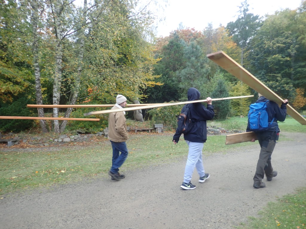 Abschließend haben die TeilnehmerInnen das Material für Vogelnistkästen gesichtet und erste Bretter für den Bau gesichert.