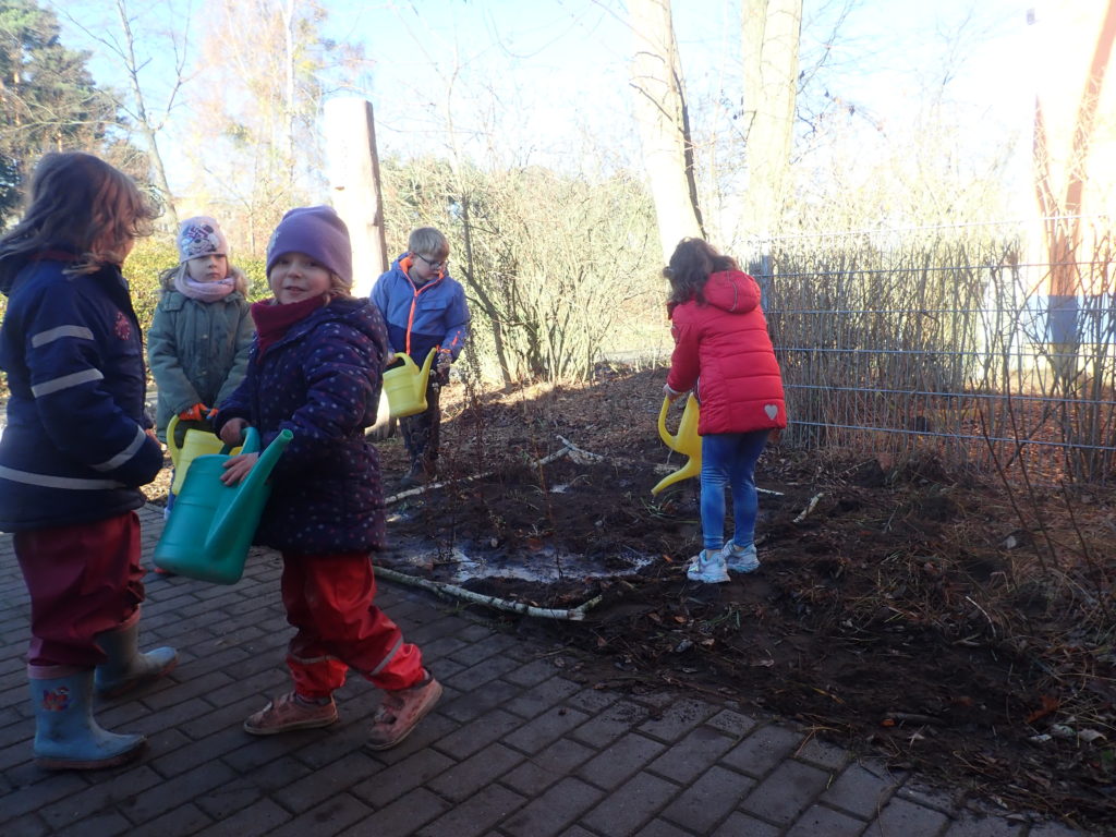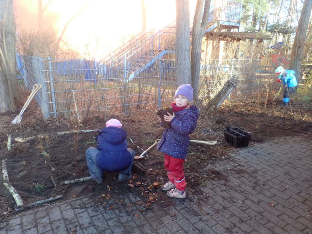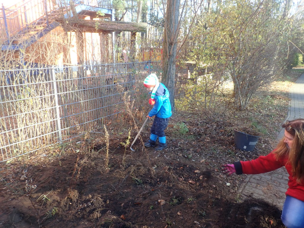 Damit die Pflanzen eingesetzt werden konnten, mussten aber erst die Beete vorbereitet werden. Darauf stürzten sich die Kinder mit großer Begeisterung. Anschließend setzten die Kinder ihre Pflanzen und gossen sie anschließend gut an. Nun freuen sie die Kinder darauf, sie im nächsten Frühjahr und Sommer wachsen und blühen zu sehen.