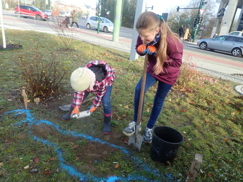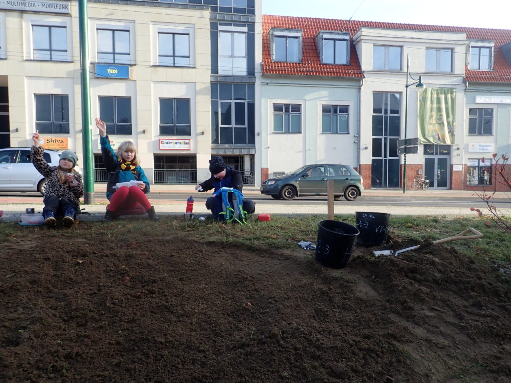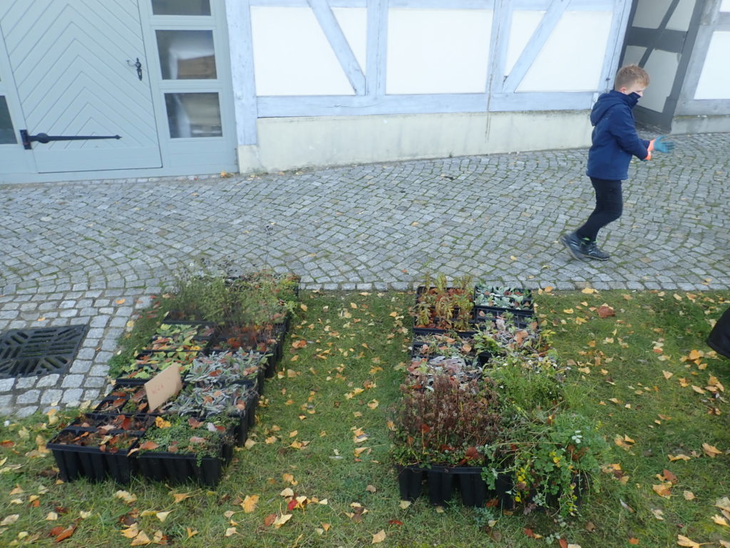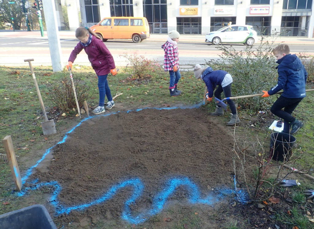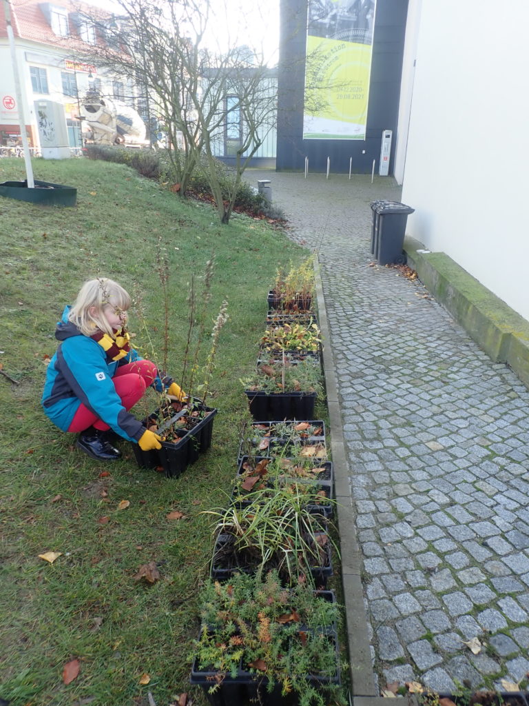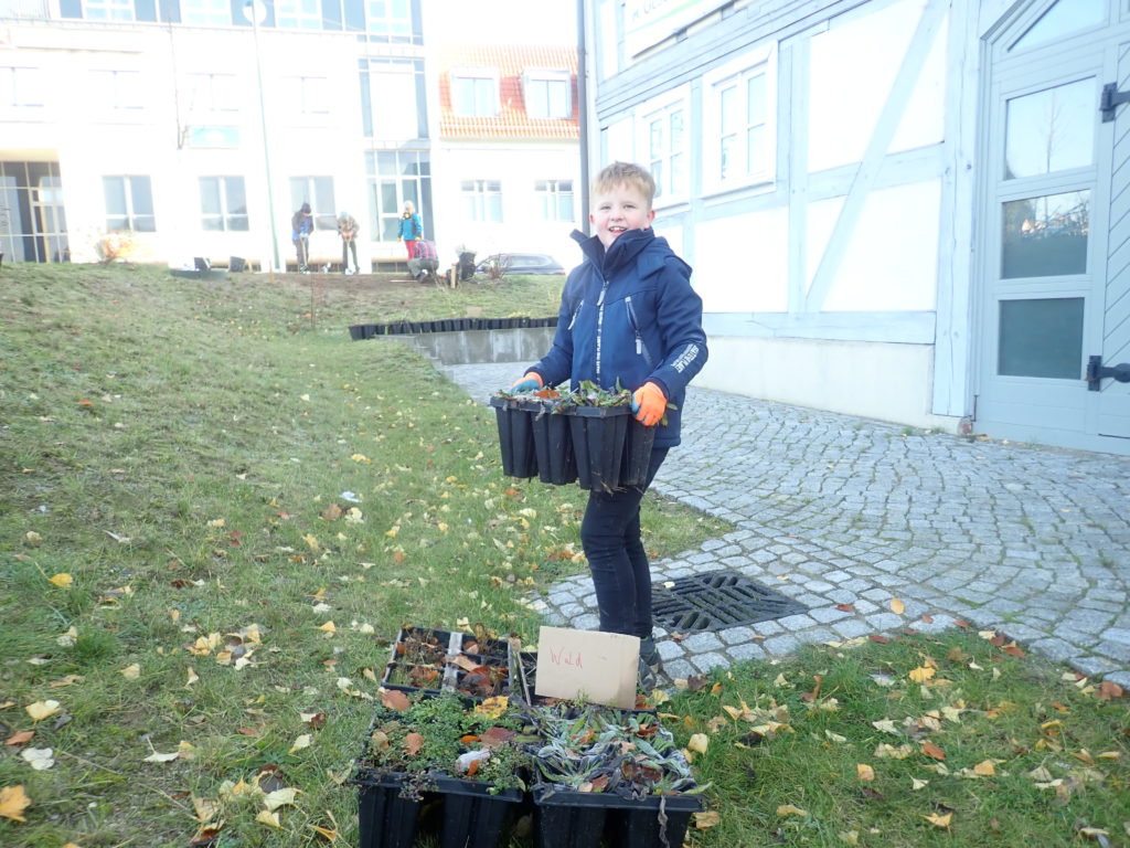 Als die Beete vorbereitet waren, ging es endlich ans Pflanzen. Jeder Clan hatte eine etwas andere Strategie, die Pflanzung umzusetzen. Manche setzten zuerst die Pflanzen auf die Beete, um zu schauen, wo jede Art hin sollte. Andere pflanzten eine Pflanzenart nach der anderen und schauten dabei, wie sich das Beet entwickelte. Am Ende entstanden 4 wunderschöne Beete und alle Kinder waren sehr stolz darauf, was sie geschafft haben. Schließlich haben die Clans insgesamt 269 heimische Krautpflanzen (Liste siehe unten) auf der Fläche gesetzt und somit eine wunderschöne Blühfläche geschaffen, an der sich alle Eberswalderinnen und Eberswalder – und nicht zuletzt die Schülerinnen und Schüler selbst – über die kommenden Jahre erfreuen können.
