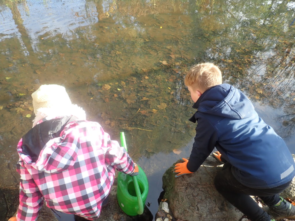 Auf der Pflanzfläche einigten sich die Kinder dann erst einmal auf eine Beetform. Dabei entstanden 4 verschiedene Formen, denn jeder Clan hatte ganz eigene Vorstellungen. Nachdem das geschehen war, wurden die Beete mit Spray umrandet und es ging daran, die Grasnarbe hochzunehmen. Alle Kinder waren eifrig dabei. Teilweise war das sehr schwere Arbeit, weil unter manchen Beetflächen sehr viele Steine lagen.