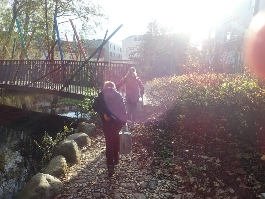 Heute war ein ganz besonderer Tag, dann wir hatten eine große Pflanzaktion mitten in der Stadt geplant. Wir wollten den Torplatz an der Flussgöttin bepflanzen. Die Schulklasse kam gut gelaunt am Pflanzplatz an und wir starteten mit einer Begrüßungs- und Namensrunde. Vom Projekt waren 4 Mitarbeiter dabei, von denen sie 2 nicht kannten und so war die Begrüßungsrunde eine gute Gelegenheit zum ersten Kennenlernen. Natürlich zogen unsere mitgebrachten Pflanzen gleich die Aufmerksamkeit der Kinder auf sich und viele konnten es nicht abwarten, sie zu verpflanzen. Zunächst teilten sich die Schülerinnen und Schüler aber in ihre Clans auf und machten sich zusammen mit den Projektmitarbeitern mit ihrer jeweiligen Fläche vertraut.