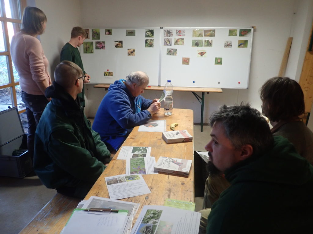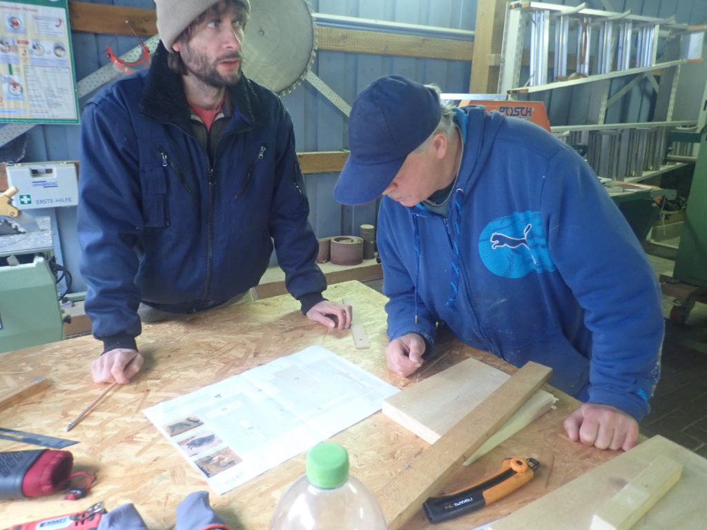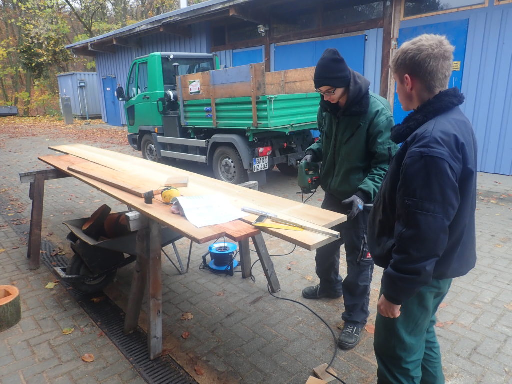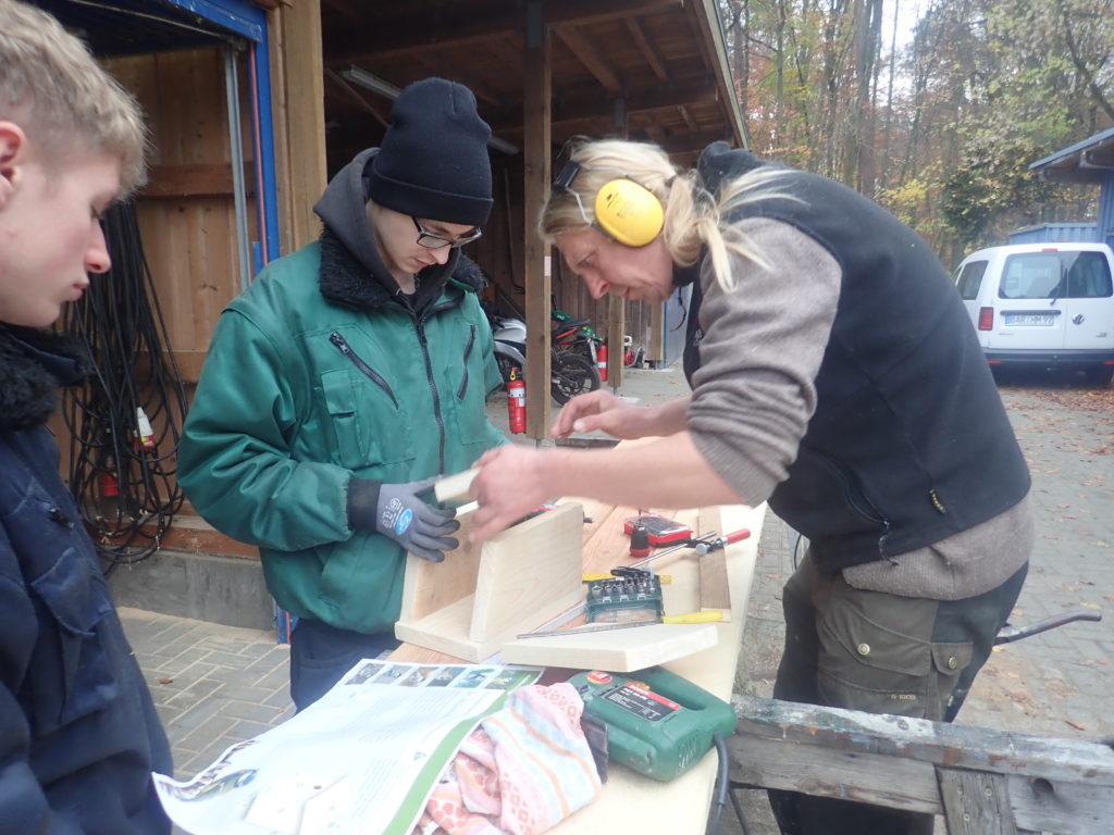 Anschließend widmete sich die Gruppe den Vogel- und Fledermauskästen, für deren Bau sie sich im Vorfeld entschieden hatten. Eine Einführung zu beiden Themen stimmt alle auf das Vorhaben ein. Nach de Mittagessen geht es dann ans Werkeln. Ein Team widmete sich dem Vogelkasten, das andere dem Fledermauskasten.