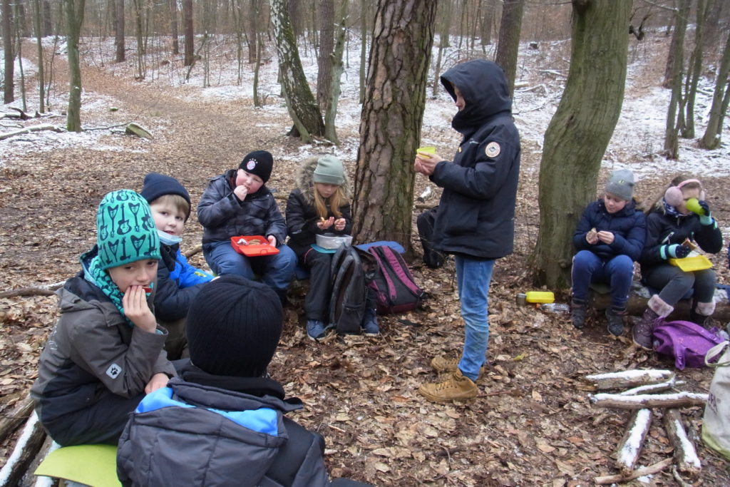 Zum Ende des Jahres ging es für die Klasse 4b noch einmal in den Wald. Der heutige Tag stand ganz im Zeichen der Spiele. Da es kalt war, spielten die Kinder gleich nach Ankunft auf dem Waldplatz das Spielt „Wintersturm“, eine saisonale Anpassung des Spiels „Waldbrand“. Dann folgte das Spiel „Baumfangen“, bei dem alle ihr Baumwissen auffrischen konnten. Nach einer Essenspause kam ungeplant der Stadtförster, Herr Florian Manns, dazu, da er eh gerade seine Runde durch den Wald drehte. Er erzähltes Interessantes über den hiesigen Wald und die Kinder konnten gleich ihr Baumwissen zum Besten geben.