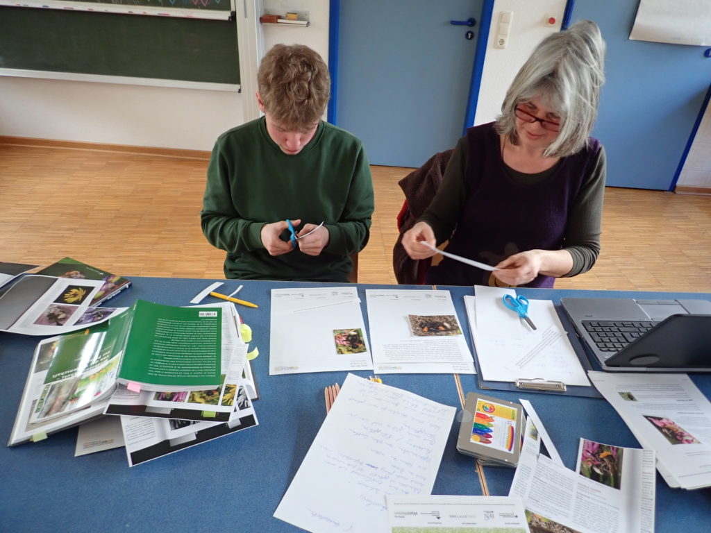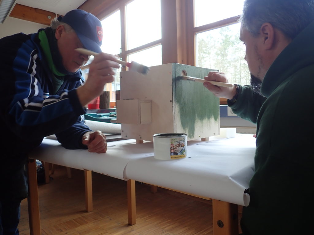 Ende des Jahres 2021 hatte die Gruppe ein Hummelhaus gebaut. Dieses musste fertiggestellt und dann dafür ein guter Platz gefunden werden. Da die Gruppe schon verschiedene Erfahrungen mit Vandalismus auf der Projektfläche gemacht hat, fällt die Entscheidung, das Hummelhaus auf die Projektfläche zu stellen, nicht leicht. Trotzdem wollen sie es probieren. Dazu muss das Hummelhaus gut getarnt werden. Die Teilnehmer sammelten heute verschiedene Ideen und beschäftigten sich weiter mit dem faszinierenden Leben der Hummeln. Denn bald werden die ersten Hummelköniginnen aus der Winterstarre erwachen. Sie suchen zunächst ein neues Nest, in dem sie ihre noch im Spätsommer und Herbst befruchteten Eier ablegen können, um ein neues Volk heran zu ziehen. Aus den befruchteten Eiern werden weibliche Arbeiterinnen schlüpfen und aus den unbefruchteten die Männchen. Bis dahin muss das Hummelhaus also stehen.