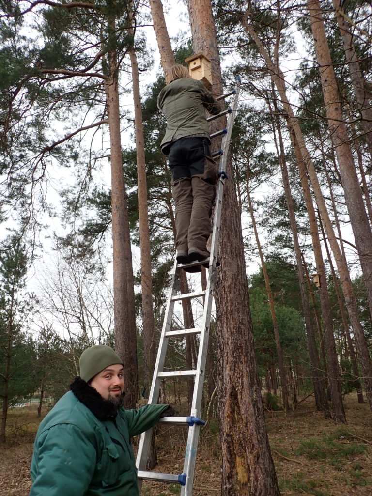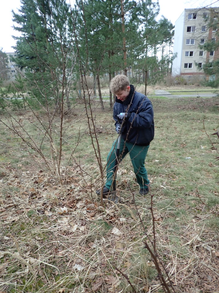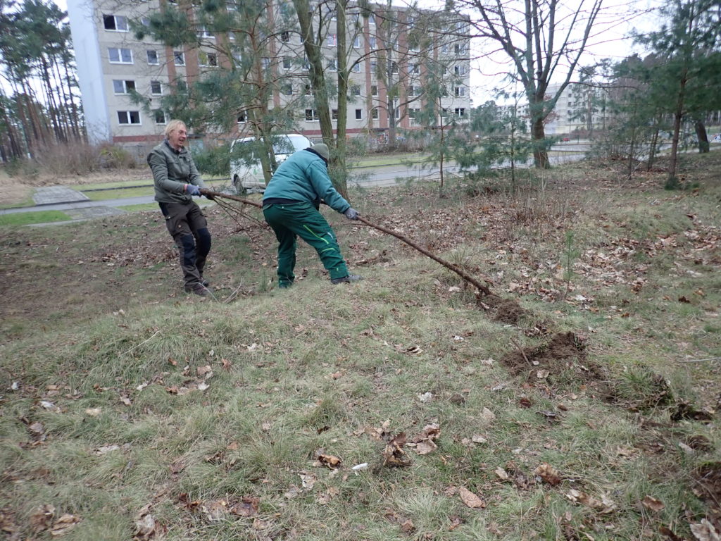 Anschließend ging es endlich auf die Projektfläche, wo Pläne für die weitere Pflege und Gestaltung geschmiedet wurden. Als Sofortmaßnahmen sammelten die Teilnehmer Müll, reinigten die Nistkästen und gruben junge Robinien aus, die sich als Neophyt aggressiv auf der Fläche ausbreiten.
