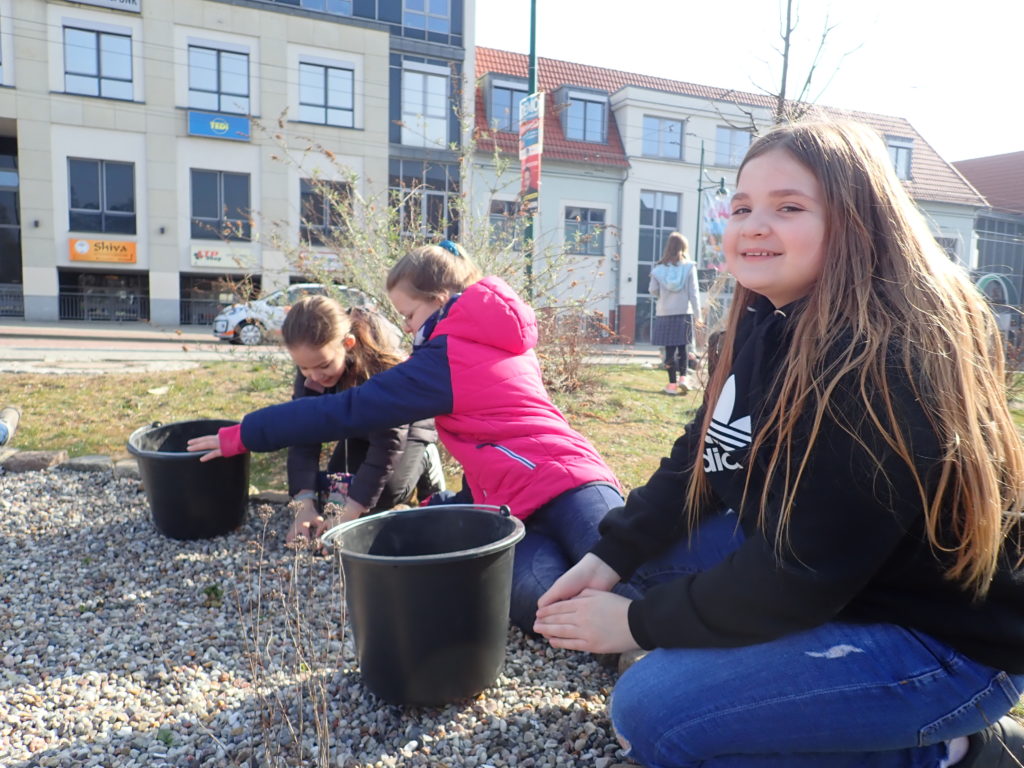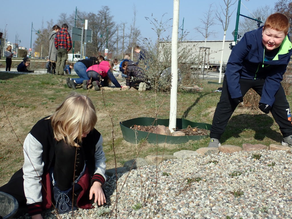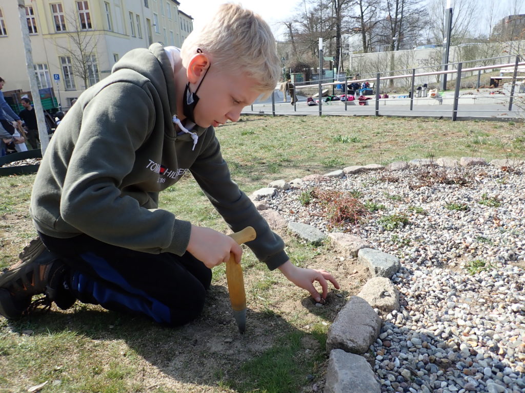 Nach der Winterpause erwachen nun auch unsere Stadtbeete wieder zum Leben. Die 4b nahm dies zum Anlass, um sich um ihre selbst angelegten Beete zu kümmern. Zunächst dünnten sie die teilweise sehr dicke Kieselschicht aus, um den Pflanzen, die sich während des Winters komplett ins Erdreich zurück ziehen, eine Chance auf ein Wiedererwachen zu geben. Anschließend setzten die Kinder noch Frühblüher um ihre Beete. Nun werden wir die Flächen gut beobachten und hier darüber berichten, wie sie sich entwickeln. Im Sommer erwarten wir eine summende Insektenweide.