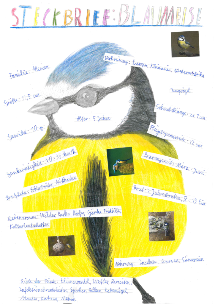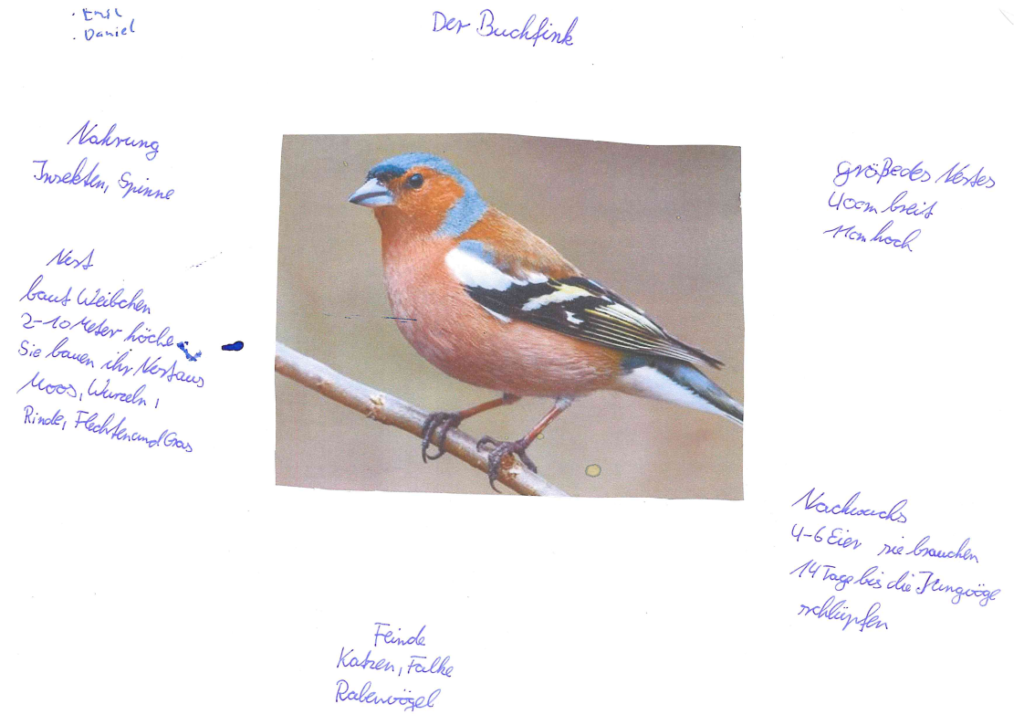 Anschließend wanderte die ganze Klasse in den Wald. Auf dem Waldplatz angekommen setzten sich alle in einen Redekreis und Marcel fragte nach verschiedenen Vogelarten. Die Klasse kam, ohne größere Hürden, auf 17 Arten. Anschließend stellten die Schülerinnen und Schüler ihre Vogelsteckbriefe vor, die sie seit der letzten Veranstaltung vorbereiten sollten. Manche Gruppen hatten besonders viel Zeit investiert und anschauliche Steckbriefe gestaltet.