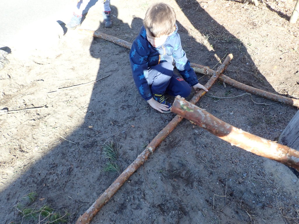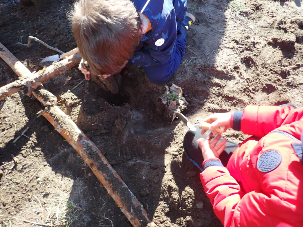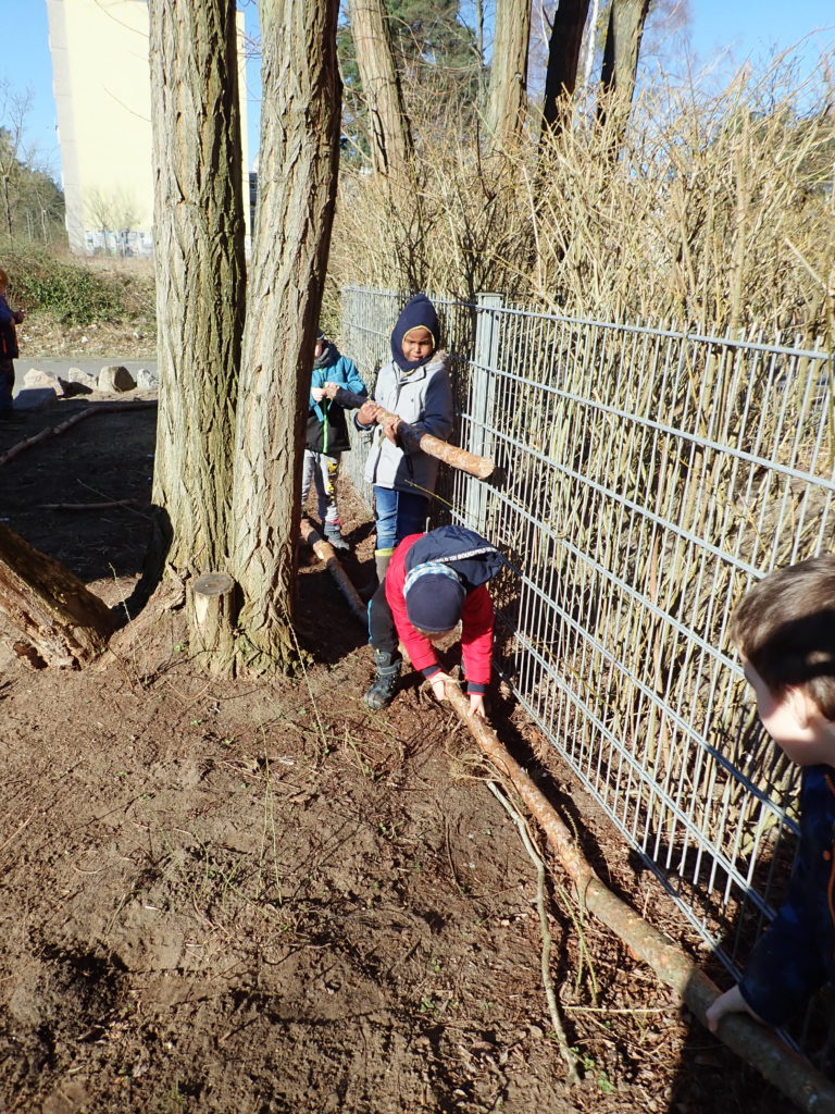 Für die Kinder der Kita Arche Noah ging es heute weiter mit den Wildbienen und deren Lebensräumen. Beim letzten Treffen haben die Kinder dafür gesorgt, dass die Wildbienen auch im Frühjahr schon Nahrung auf der Projektfläche finden, indem sie Dichternarzissen pflanzten. Heute erweiterten die Kinder den Lebensraum der Wildbienen um Totholzelemente, die sie um die Wildbienennisthilfe legten.