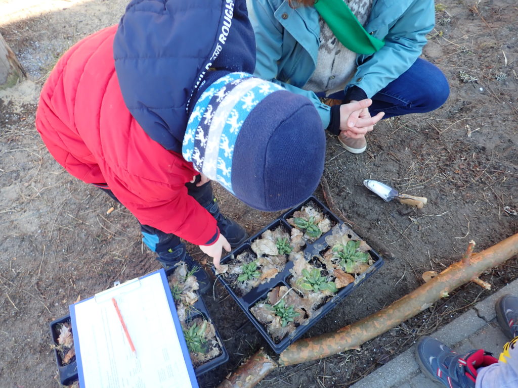 Anschließend pflanzten die Kinder weitere Futterpflanzen für die Wildbienen: Wiesen-Schlüsselblumen (Primula veris). Die Fläche um die Wildbienennisthilfe entwickelt sich Dank der fleißigen Kinderhände prächtig. Wir freuen uns zusammen mit den Kindern darauf, wie sie sich in den kommen Wochen entwickeln wird.