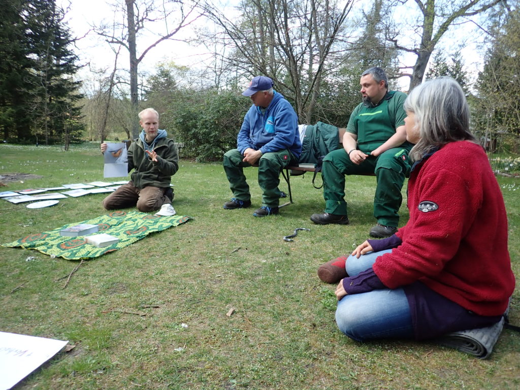 Heute war die Vielfalt der Tiere, ganz genau die Vielfalt der heimischen Vogelwelt, Thema bei den Erwachsenen. So ging es für die Vogelbeobachtung auch dieses Jahr in den Forstbotanischen Garten, wo die TeilnehmerInnen zunächst übten, sich übers Gehör an einen Vogel anzuschleichen. Das stellt die TeilnehmerInnen immer wieder vor eine große Herausforderung, denn die Vögel sind sehr wachsam und scheinen immer einen Flügelschlag voraus.