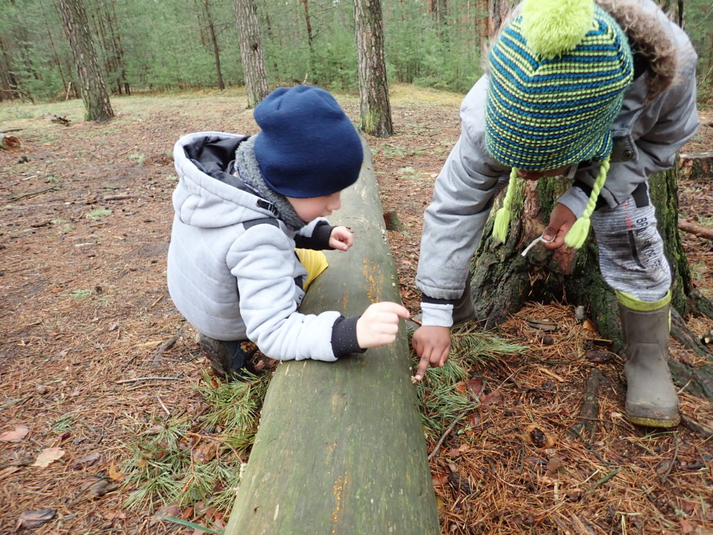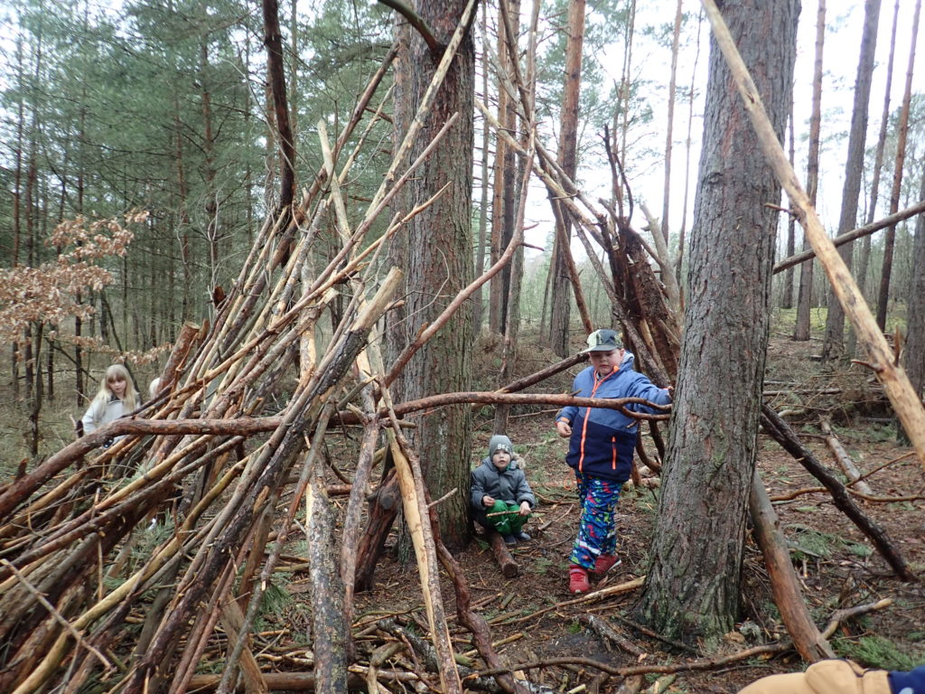Heute war ein regnerischer Tag. Das hielt aber die Waldgruppe der Kita Arche Noah nicht davon ab, nach draußen zu gehen. Um nicht zu viel Regen abzubekommen, entschloss sich Maike dazu, die gesamte Veranstaltung im Wald stattfinden zu lassen. Das fanden die Kinder natürlich super und auf ging es zum Waldplatz! Dort gab es wieder eine Menge zu entdecken und zu tun. Einige Kinder bauten weiter an ihrer Bude. Andere sammelten Steine oder entdeckten wunderschöne Baumpilze. Zwei Kinder bauten an einem Hummelhaus. Es bestand aus einem Honiglager aus Kiefernnadeln, einem Birkenstamm als Sitzplatz, einer Feuerstelle, einer Klingel aus einer speziellen Astgabel.