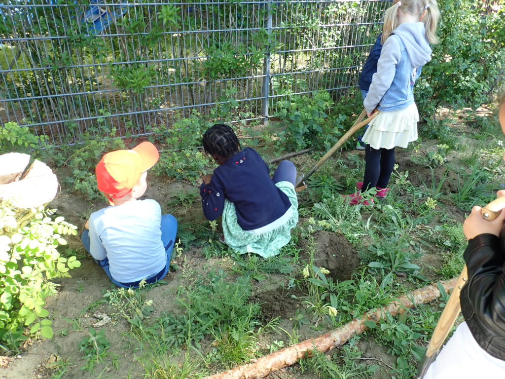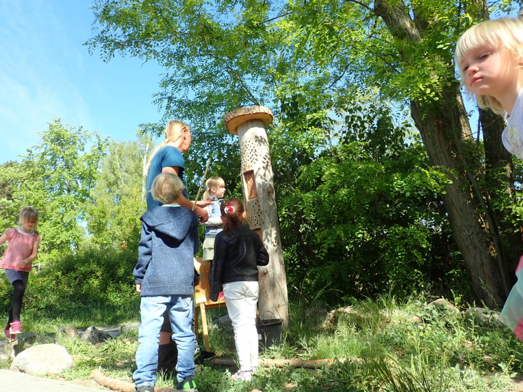 Heute haben die Kinder der Kita Arche Noah ihre Projektfläche weiter bepflanzt und die Insektennisthilfe mit noch mehr Bambusröhrchen versehen. Bevor es ans Pflanzen und Bauen ging, begaben sich die Kinder auf einen Wildbienenflug über das Gelände. So sollten sie noch einmal schauen, welche Blüten die Bienen auf der Fläche finden. Anschließend pflanzten sie dann die folgenden Krautpflanzen, um das Nahrungsangebot noch zu erhöhen: