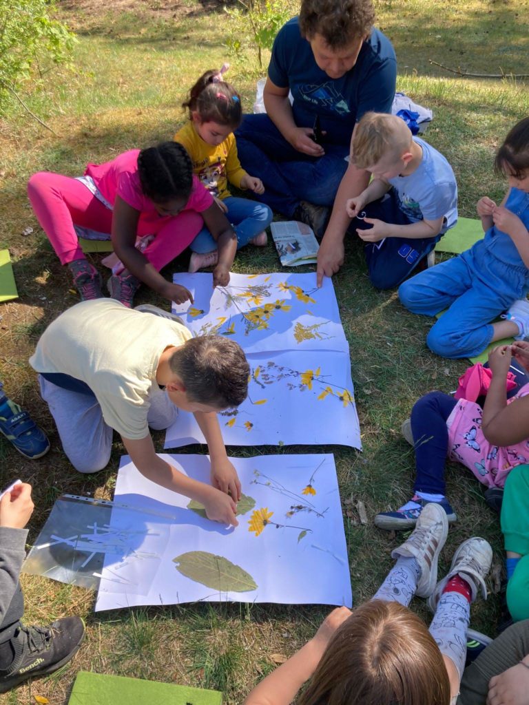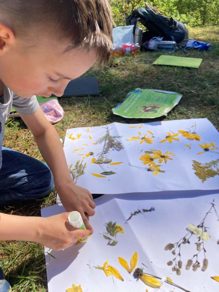 Am Waldplatz angekommen, erinnerte Gabriela die Kinder an die Blumen, die sie im vergangenen Spätsommer gesammelt und gepresst hatten. Sie hatte die Blumen wieder mit dabei und gemeinsam klebten sie die Blüten und Blätter nun auf große, weiße Poster für die Kita auf.