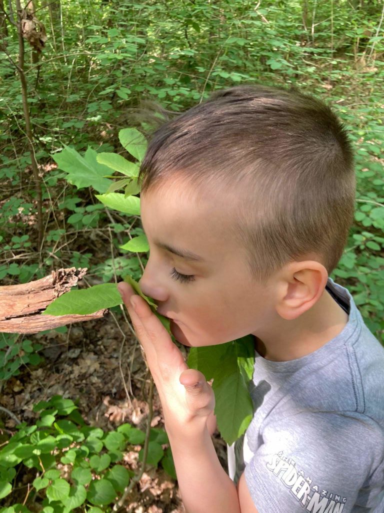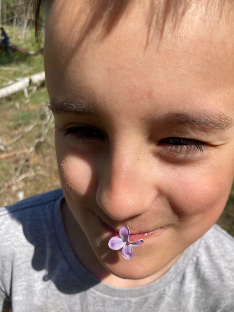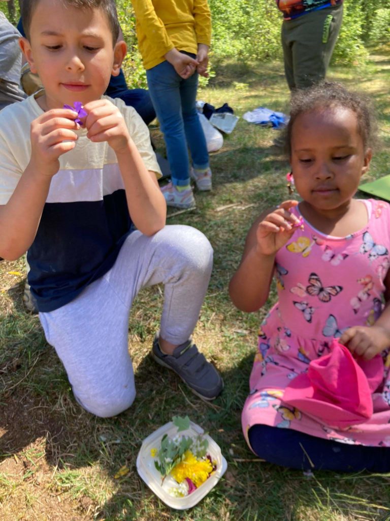 Anschließend diskutierte die Gruppe, für wen denn die Blüten eigentlich gut sind. Die Kinder kamen sehr schnell darauf, dass sie Nektar für die Insekten bereitstellten. Um die Kinder erleben zu lassen, warum der Nektar so verlockend ist, holte Gabriela noch frische Fliederblüten hervor. Sie ermunterte die Gruppe, an den einzelnen Blüten zu saugen und den Nektar zu kosten. Die Kinder waren sehr erstaunt über die Süße des Nektars und hätten gern noch andere Blüten probiert.