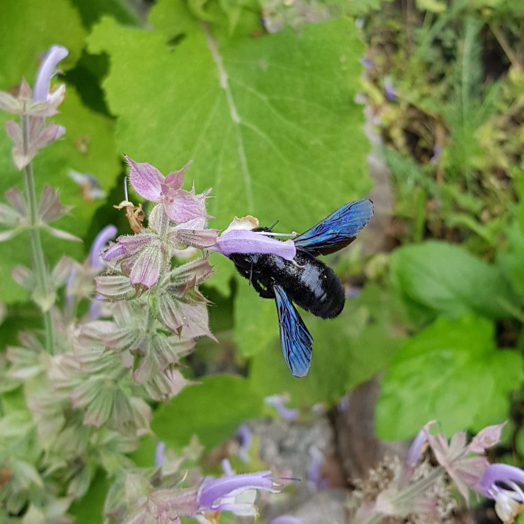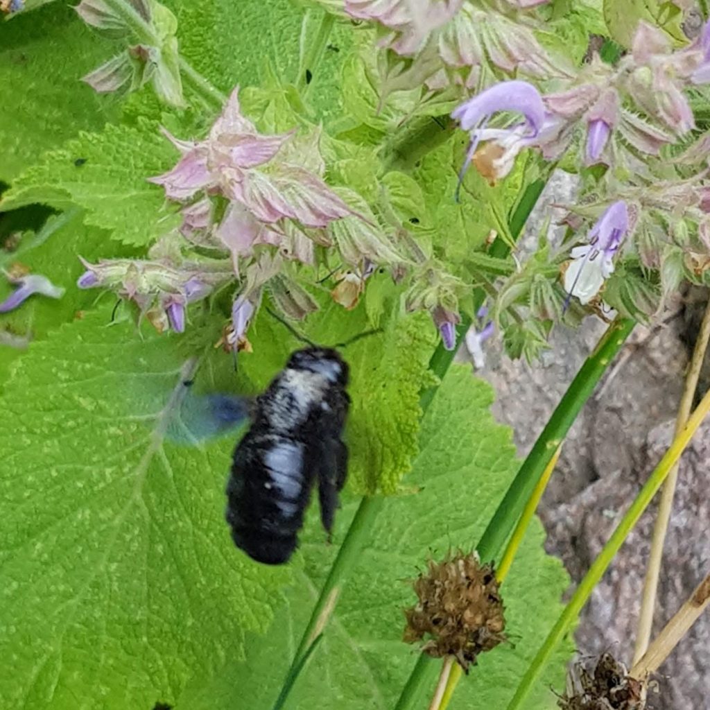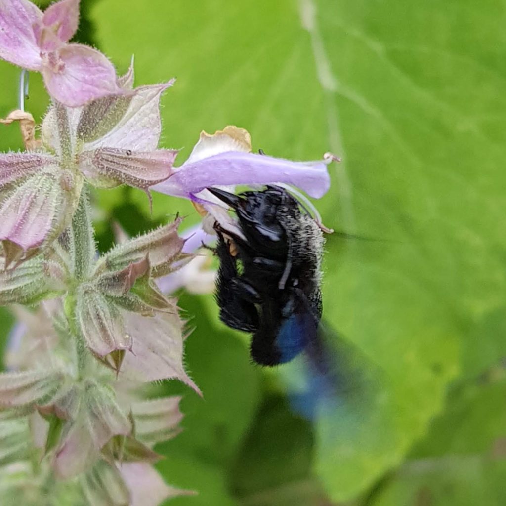 Die Blaue Holzbiene (Xylocopa violacea) wird in unseren Breiten (nordöstliches Brandenburg) erst seit ein paar Jahren gesichtet. Mit dem Klimawandel und dem damit einhergehenden wärmeren Klima bewegt sie sich immer weiter nach Norden fort. Die Holzbienen ist nicht zu übersehen, denn sie erreicht eine Körperlänge von bis 28 Millimetern. Dabei ist sie aber, wie die meisten anderen Wildbienenarten, sehr friedfertig und man kann sie getrost dabei beobachten, wie sie von Blüte zu Blüte brummt. Denn auch das ist kaum zu überhören. erst kürzlich haben wir eine Holzbiene an unseren Büros gesichtet. Es ist immer wieder beeindruckend, wenn man diesem Brummer begegnet. Dabei kann jeder dafür sorgen, dass wir in Zukunft noch mehr von dieser schönen Biene sehen werden. Wie ihr Name verrät, benötigt diese Biene Holz, genauer Totholz, dass noch nicht zu morsch ist, um ihren Nachwuchs großzuziehen. In abgestorbene, sonnenbeschienene Baumstämme nagt sie mit ihren kräftigen Kiefern fingerdicke, bis zu 30 Zentimeter lange Nistgänge hinein. Lasst also totes Holz liegen. Auch andere Insekten werden sich bedanken!