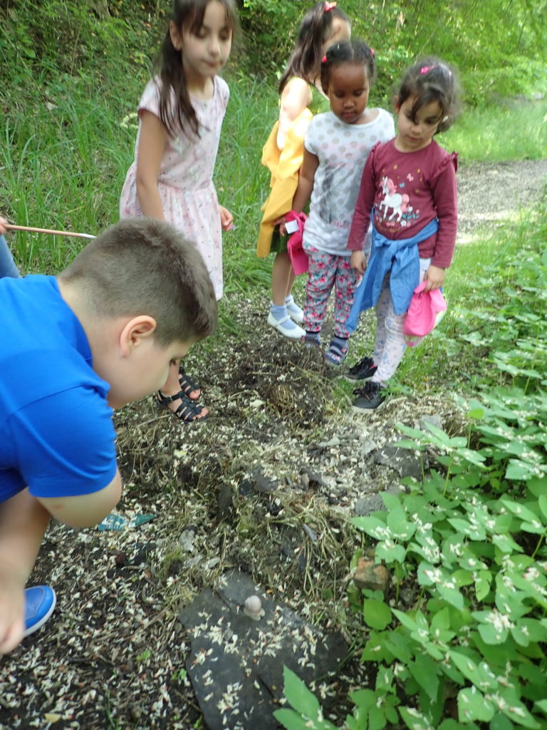 Am Waldplatz angekommen, schauten sich die Kinder zunächst ein Blütenmodell an. Gabriela erklärte, wo der Pollen und der Nektar in der Blüte zu finden seien. Anschließend bekam jedes Kind eine Jasminblüte, um selbst die Pflanzenteile zu entdecken. Wieder kosteten sie den Nektar und befanden ihn als sehr süß. Aber wie kommen den eigentlich die Bienen an den Nektar, wenn er so weit unten in der Blüte sitzt? Gabriela zeigte Bilder von Bienen mit ausgefahrenen Rüsseln und sofort ahmten die Kinder nach.