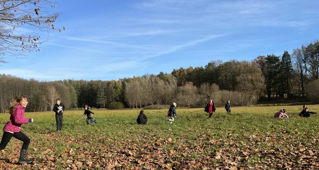 Heute beschäftigte sich die 4b der Karl-Sellheim-Schule mit den Winterstrategien: Winteraktiv, Winterflucht, Winterruhe, Winterstarre und Wintertod. Bevor sie beginnen konnten, bauten die Kinder ihr Waldsofa wieder neu auf. Dann sammelten sie heimische Wildtierarten zusammen und überlegten, welche Strategien dieser verfolgen. Anschließend ließ Marcel sie aktiv die Winterstrategie des Eichhörnchens überleben und leitete zum Eichhörnchenspiel über. Alle Kinder bekamen 8 Nüsse und Mandeln und dazu die Aufgabe, alles zu verstecken. Zur Ablenkung spielten sie dann „Alle fangen Alle“ auf der Wiese.
