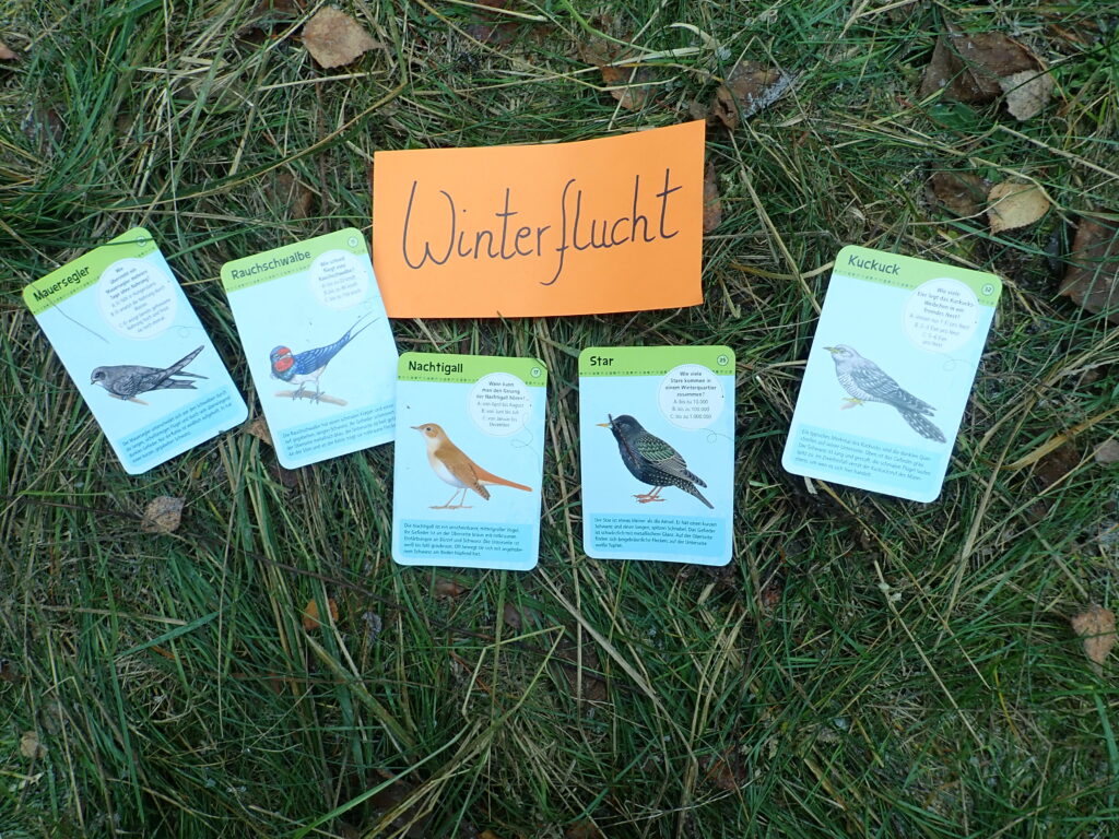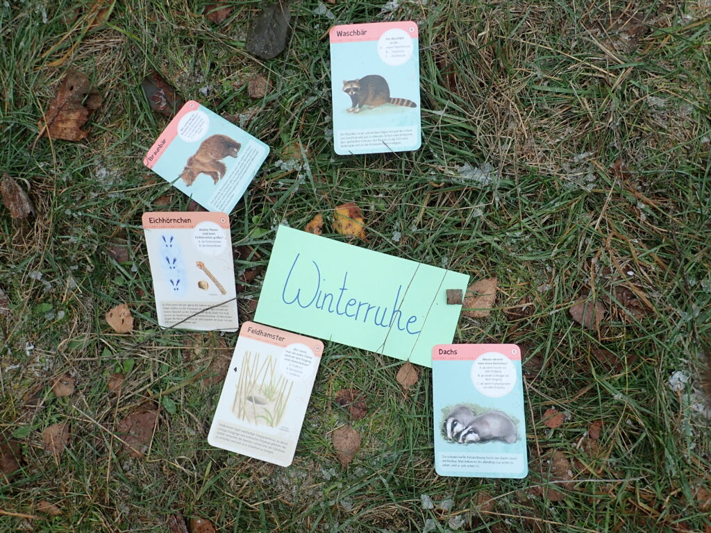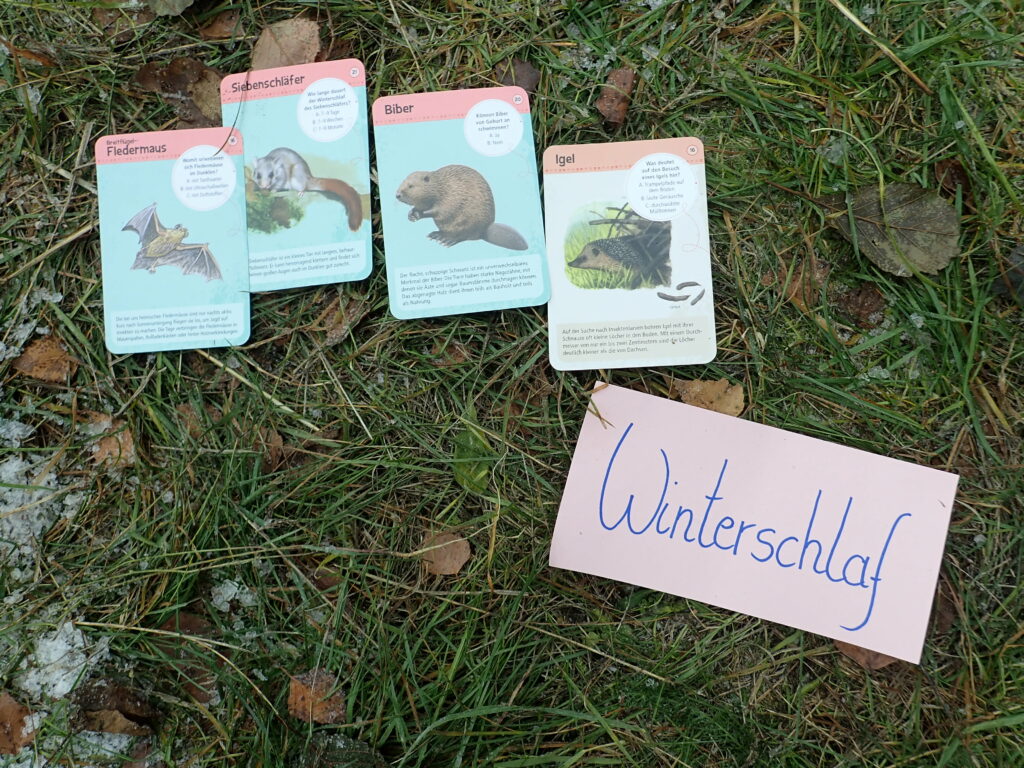 Nun stellten die Erwachsenen mithilfe von Pantomime 4 der Winterstrategien vor: Winterschlaf, Winterstarre, Winterruhe und Winterflucht. Die Klasse schaffte es, alle zu erraten. Anschließend ordneten sie dann die verschiedenen Tiere den Winterstrategien zu.