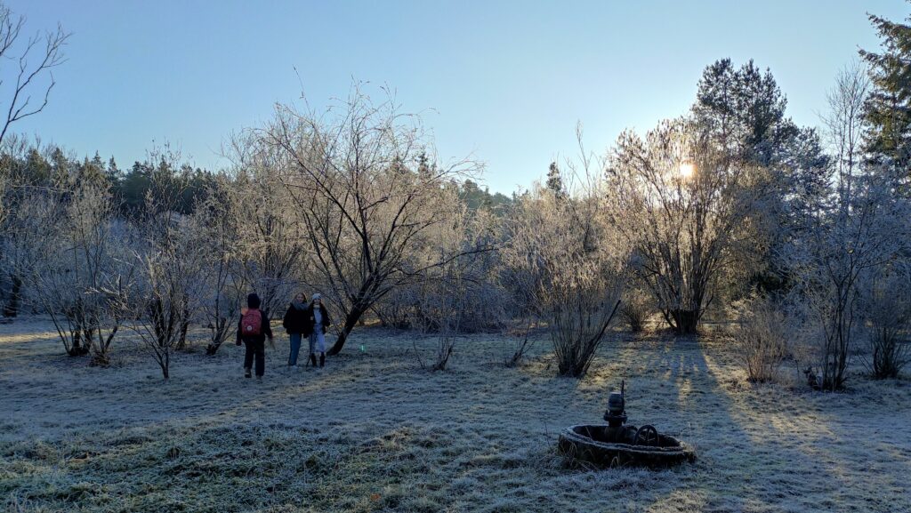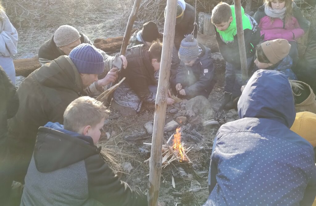 Im Versuchsgarten angekommen, spielte die Klasse ein Aufwärmspiel bevor sich alle am Feuermachen versuchen konnten. Dafür hatte Marcel Schlageisen und Feuersteine und als 2. Variante Magnesiumstäbe mitgebracht. Das erste Feuer brannte recht schnell und so konnten sich die Kinder dort immer wieder aufwärmen. Anschließend teilte sich die Klasse in kleiner Gruppen auf, um Gemüse zu schnippeln, Feuerholz zu sägen, Feuerholz zu sammeln und das Feuer zu hüten sowie ein zweites Feuer zu entfachen.