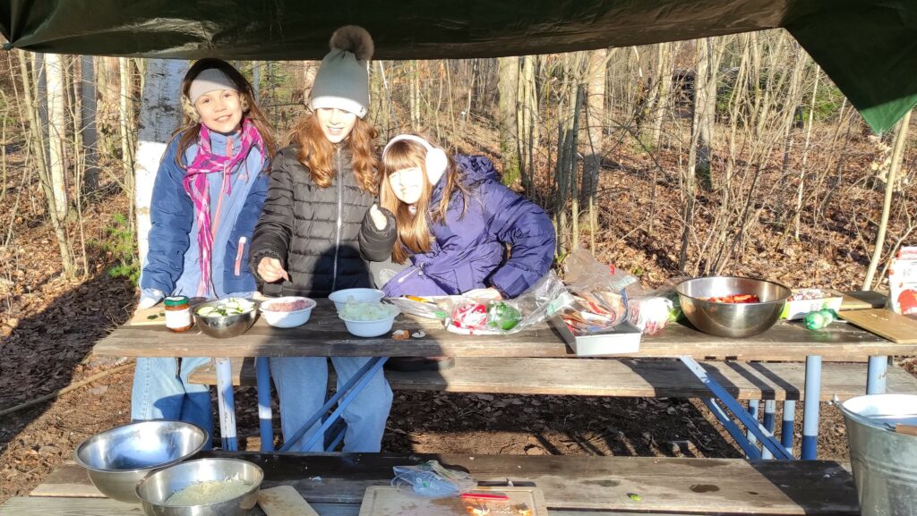 So erledigten alle Gruppen ihre Aufgaben. Es wurde fleißig Gemüse geschnippelt, eine Pizzasoße angerührt, Feuerholz in Überfluss gesammelt und gesägt und ein zweites Feuer entfacht. So konnten die Kinder schon bald ihre über Feuer selbstgebackenen Pizzen genießen. Das schmeckte allen besonders gut. Abschließend verabschiedeten sich die Kinder in der Winterferien.