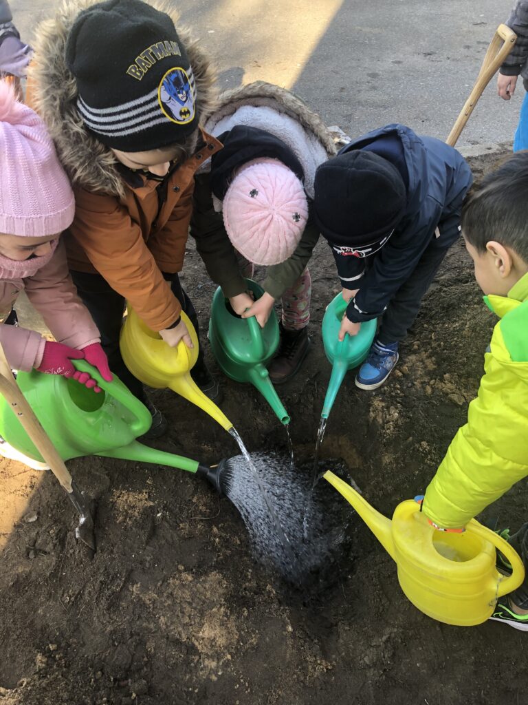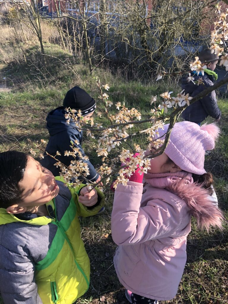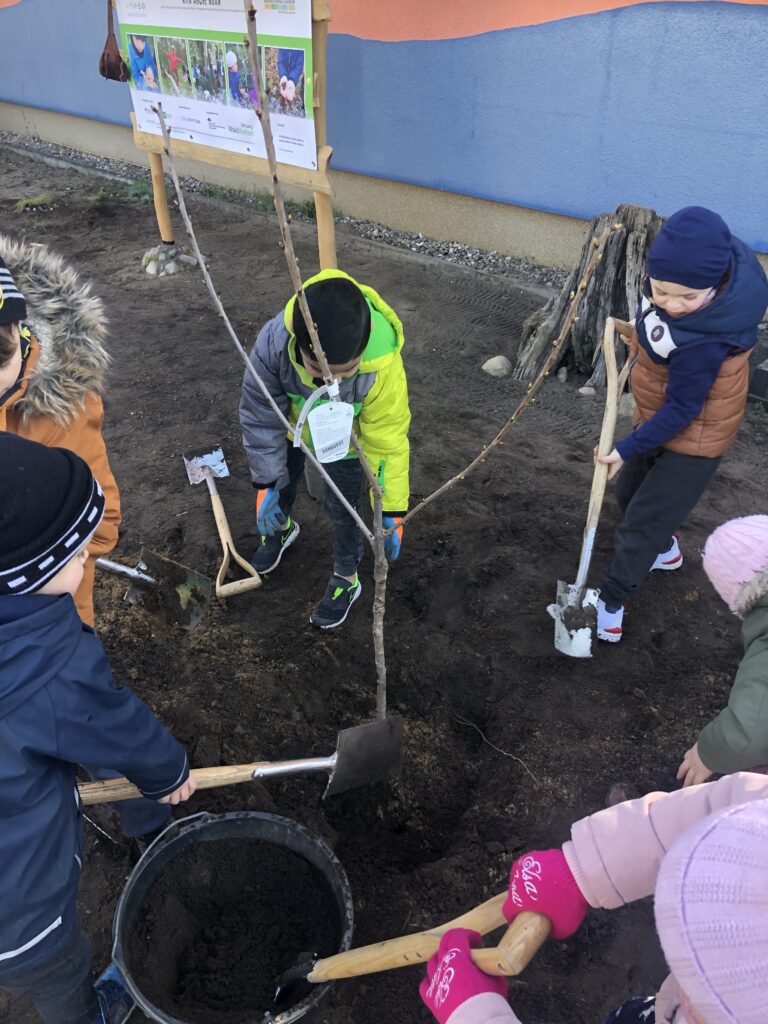 Zu frühlingshaftem Sonnenschein war der heutige Projekttag für die Kitakinder der Kita Arche Noah ein ganz besonderer Tag! Gemeinsam pflanzten sie mit ihrer Erzieherin und Maike „Ihren Baum“. Dazu ging es zuerst nach einem ausgelassenen Naturspiel über die Wiese zu einem blühenden Apfelbaum, den sie liebevoll „großer, weißer Baum“ nennen. Sie erkundeten den Baum, rochen an den nektargefüllten Blüten und beobachteten Wildbienen, wie eine Erdhummel Königin. Damit war die Motivation besonders hoch einen eigenen Obstbaum zu Pflanzen und von ihm zu naschen. Nach einem gemeinsamen raten, kamen sie schnell auf die Baumart: eine Süßkirsche. Durch die wiederholenden Pflanzaktionen war das Loch graben mit Spaten kinderleicht geworden. Das Pflanzloch für ihren Baum war deutlich tiefer und breiter als der Wurzelballen. Zuerst wurde das Loch gemeinsam mit Wasser gut eingeschlämmt und mit etwas Hornspäne gedüngt. Maike brach den Wurzelballen auf um das Wurzelwachstum der Kirsche zu aktivieren. Die Kinder waren sehr interessiert und fragten direkt nach. Auch lernten sie dabei, dass Wurzeln wie Strohhalme sind und der Baum damit das Wasser aus dem Boden saugt. Nachdem gemeinsam der Baum vorsichtig im Loch eingelassen wurde, mischten sie gemeinsam 1:1 Komposterde unter und formten einen schönen Gießring aus Erde und Steinen. Das Abschlussgießen war so beliebt, dass ein Kreis um den Baum entstanden ist und jedes Kind einmal gießen konnte. Um auch den ökologischen Wert der Kirschblüten zu verinnerlichen hatte Maike Insektenbilder an Bambusstangen mitgebracht. Die Kinder verteilten diese um die Kirsche, aber auch um ihre gepflanzten Frühblüher, den Schlüsselblumen. Die Kinder freuen sich schon auf die süßen Kirschen und wir freuen uns mit Ihnen!