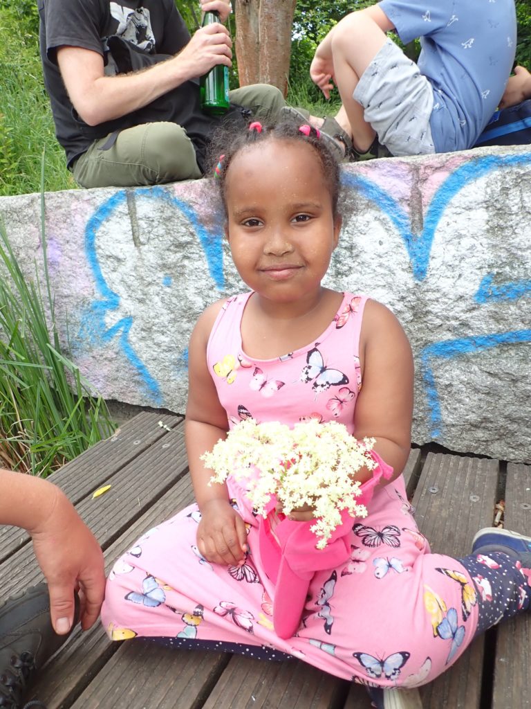 Wie bei jeder Veranstaltungen, machten auch heute die Kinder wieder erst am Wildblumenbeet vor der Kita halt. Die Fläche hat sich prächtig entwickelt. Es blüht und summt. Die Kinder beobachteten das emsige Treiben und naschten dabei Wilderdbeeren, die sich auf der Fläche ausbreiten. Anschließend ging es weiter zum Kanal und entlang am Wasser, um Holunderblüten