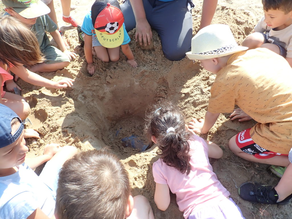 Heute ging es für die Kinder auf große Schatzsuche, denn für die Abschlussveranstaltung hatte sich Gabriela eine spannende Schnitzeljagd ausgedacht. An der ersten Station durften die Kinder Bienen sein. Ausgestattet mit kleinen Pipetten und Löffeln „flogen“ sie emsig hin und her, um Nektar und Pollen zu sammeln und diesen zurück zu ihren Nestern zu bringen.
