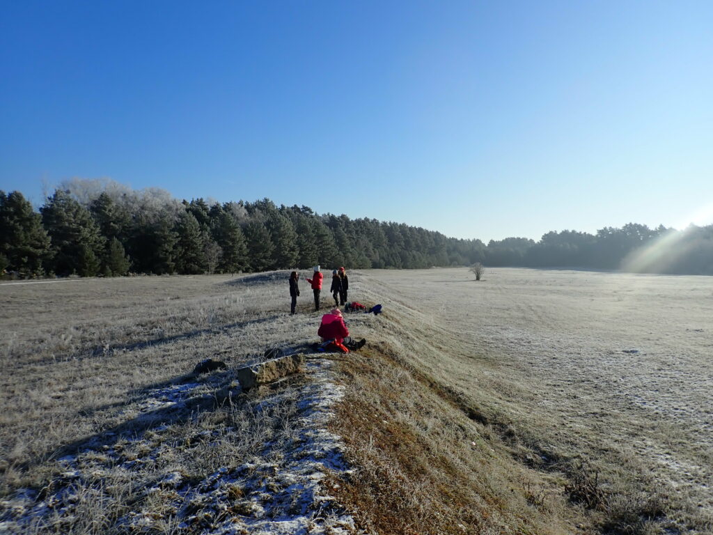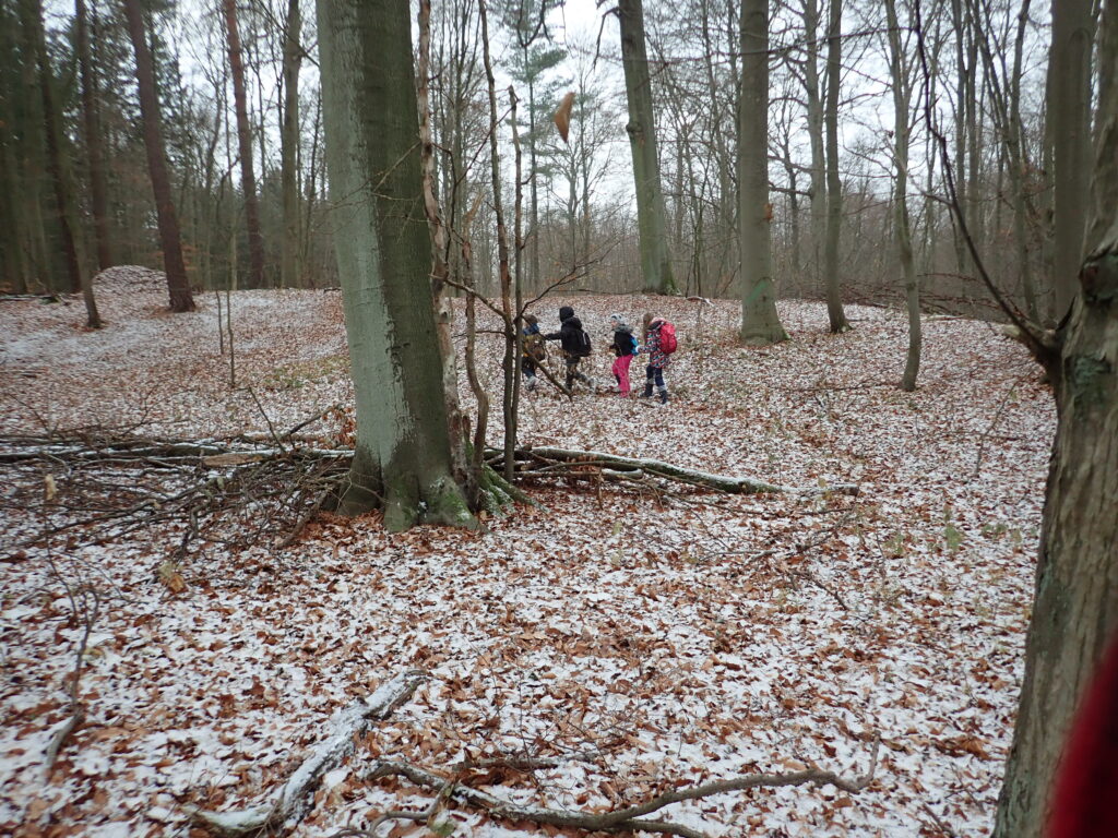 Heute wanderten die Kinder durch den Wald zum Versuchsgarten der Stiftung WaldWelten. Im Wald angekommen, machten sie zunächst ein paar Aufwärmübungen, denn es war noch mal so richtig kalt geworden. Dann wanderten sie weiter durch den Winterwald und Maike stellte das Spiel „Adlerauge“ vor. Innerhalb von 5 Sekunden mussten sich alle Kinder so verstecken, dass