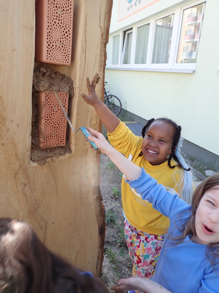 Seit Mai 2021 gestalten die Kinder der Kita Kinderland die Grünflächen vor ihrer Kita, um Insekten einen Zufluchtsort zu bieten. Heute haben sie die Fläche um einen Wildbienenhaus erweitert. Dafür wurde ein Eichenstamm der Länge nach halbiert und ein Bereich ausgehöhlt, in den Wildbienenniststeine eingesetzt wurden. Die Kinder verkleideten dann die Zwischenräume mit Lehm und […]